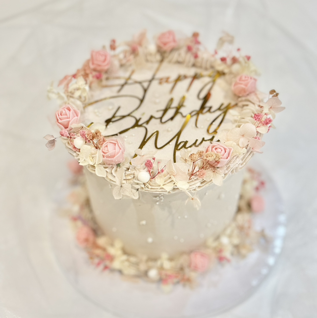 Celebrate with our delicate floral birthday cake! Freshly baked and sure to impress, this cake offers a delightful taste experience. Make their day extra special with a personalised touch – add a custom message! Available in a variety of flavors.