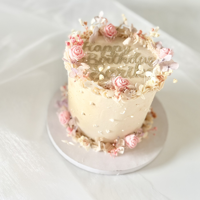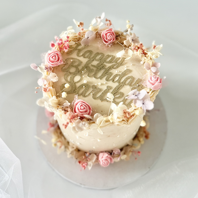 Celebrate with our delicate floral birthday cake! Freshly baked and sure to impress, this cake offers a delightful taste experience. Make their day extra special with a personalised touch – add a custom message! Available in a variety of flavors.
