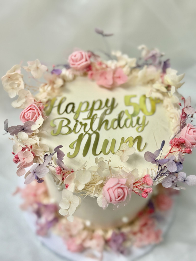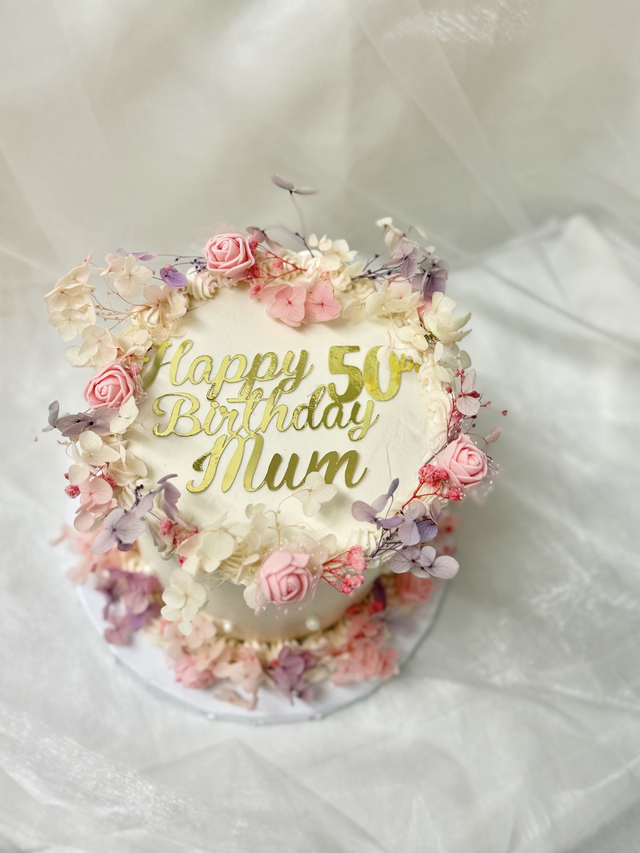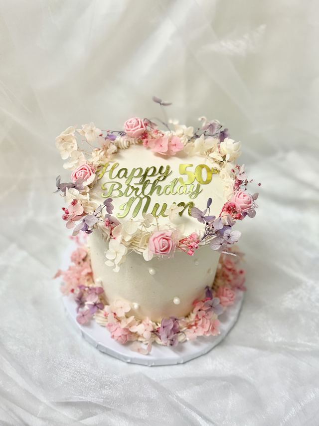 Celebrate with our delicate floral birthday cake! Freshly baked and sure to impress, this cake offers a delightful taste experience. Make their day extra special with a personalised touch – add a custom message! Available in a variety of flavors.