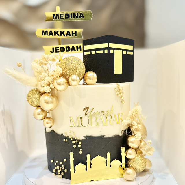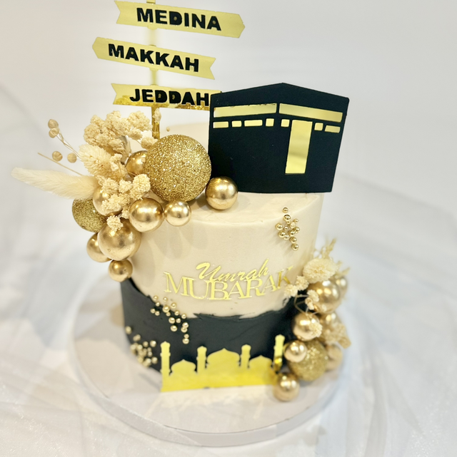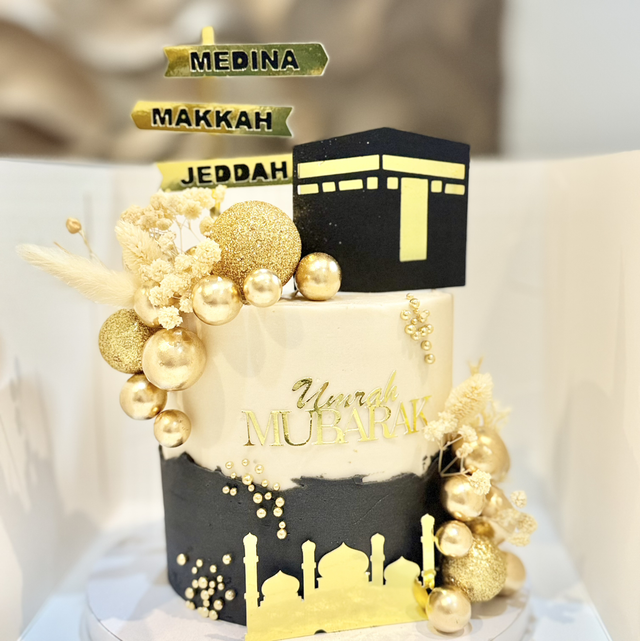 Celebrate with our Umrah/ Hajj/ Ramadan Mubarak Cake in black & gold! Freshly baked and sure to impress, this cake offers a delightful taste experience. Make their day extra special with a personalised touch – add a custom message! Available in a variety of flavours.